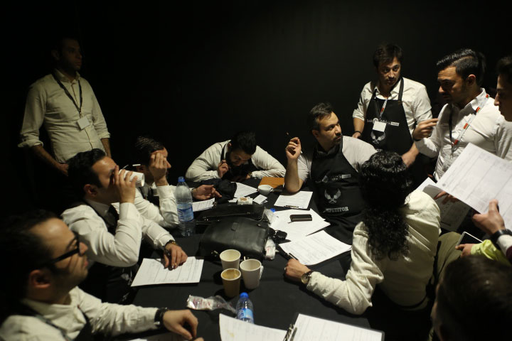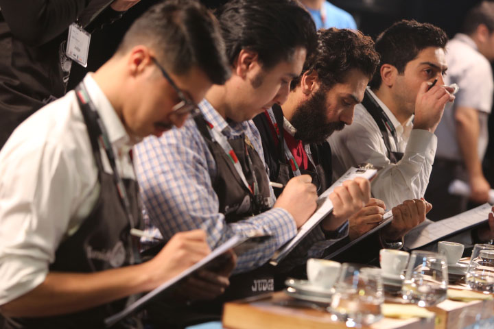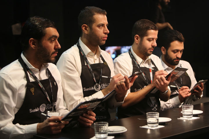 چهار داور حسی (سنسوری)، دو داور تکنیکال و یک سرداور بر اساس ضوابط مشخصی به هر باریستا نمره میدهند. از چپ: بهنام عبدی، امیر منتظر، صفا هراتیان و سامان میرزابابایی