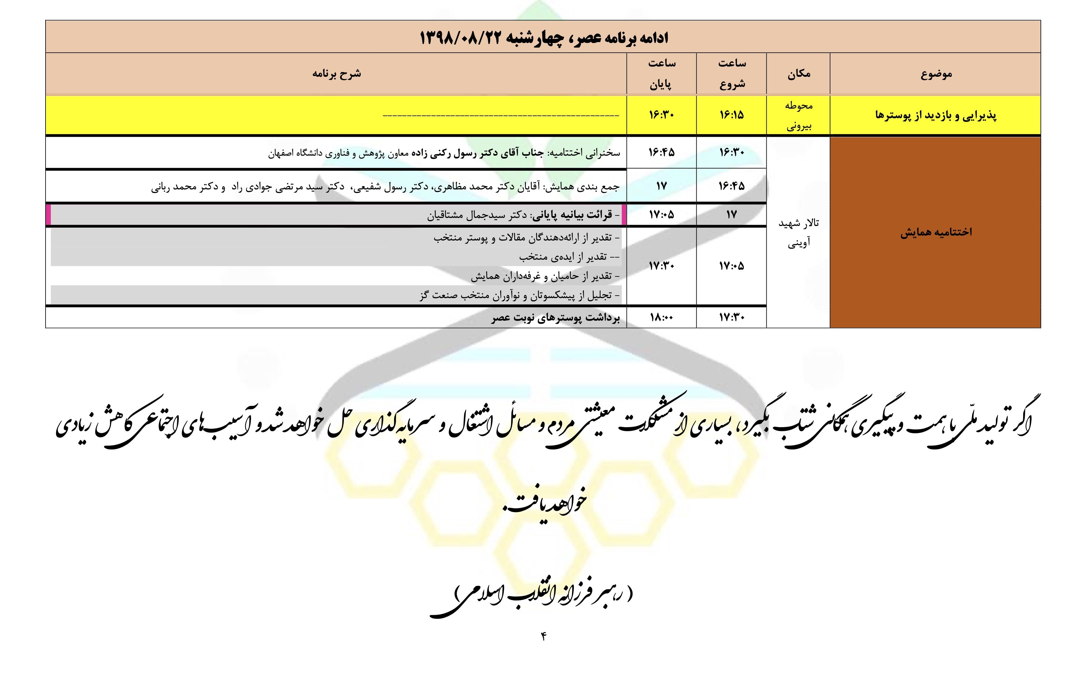 مراسم افتتاحیه از ساعت ۷:۳۰ صبح چهارشنبه در تالار شهید آوینی آغاز شده و همایش تا ساعت ۱۸ برقرار خواهد بود.