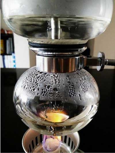(۱۱) خلاء داخل حباب بعد از حذف منبع حرارت باعث میشود که قهوهی دمکشیده از قیف به حباب برگردد. اما چون سرِ راه صافی گذاشتهایم، قهوهی آسیابشده بالا میمانَد و نوشیدنی حاصل، قهوهی شفاف و خوشرنگی خواهد بود که در حباب جمع میشود.