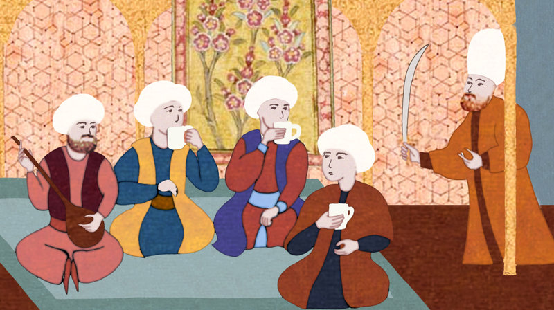 از سوی دیگر، بنا به یک داستان تاریخی، گفته می‌شود یکی از وزرای دربار عثمانی، مخفیانه به قهوه‌خانه‌ای می‌رود و متوجه می‌شود کسانیکه مشروب خورده‌اند، مست می‌شوند و دیوانه‌وار می‌رقصند و بذله‌گو شده‌اند، در حالی که افرادی که قهوه می‌خورند رفتارشان متین و هوشیارانه است و بهتر با حکومتی‌ها برخورد می‌کنند.