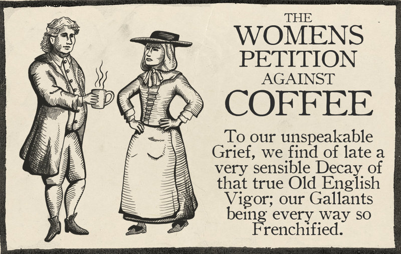 شاید شنیع‌ترین دعوا بر سر قهوه مربوط باشد به «دادخواست زنان علیه قهوه» که در سال ۱۶۷۴ در انگلستان چاپ و منتشر شد. این بیانیه‌ی شش صفحه‌ای که پر است از استعارات ادبی غلیظ، مدعی می‌شود قهوه مسبب تمام ضعف‌ها، ناتوانی‌های جنسی و لاغری است. در یکی از پاراگراف‌های آن آمده است که «مصرف این نوشیدنی تازه مد شده‌ی مکروهِ کافرپسند که نامش را گذاشته‌اند «قهوه»، شوهران ما را عقیم و بی‌ثمر می‌کند.» (برای بیان این جمله از ضمیر مونث برای قهوه استفاده شده است.)